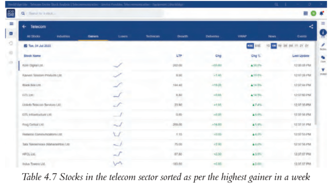 Table 4.7 Stocks in the telecom sector sorted as per the highest gainer in a week