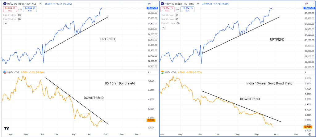 Figure 5.57 Daily chart of Nifty50, the US ten-year Bond Yield, and India ten-year Govt. Bond Yield