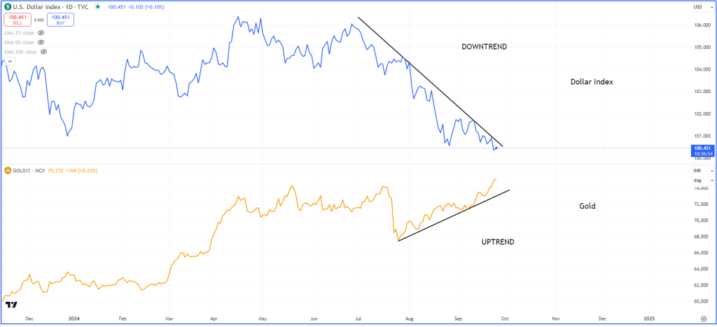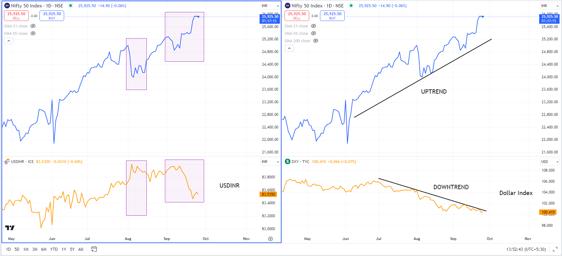 Figure 5.54 Daily chart of Nifty 50, USDINR and Dollar Index