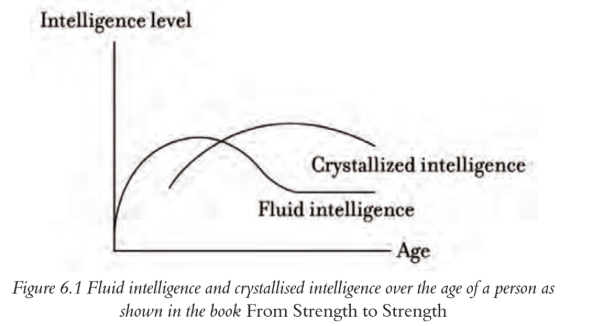 Figure 6.1 Fluid intelligence and crystallised intelligence over the age of a person as shown in the book From Strength to Strength